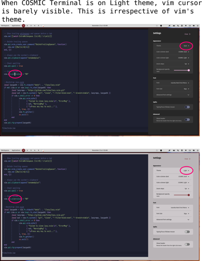 arrow-up148arrow-down1imageWhen COSMIC Terminal is on Light theme, vim cursor is barely visibleplus-squarelemmy.worldAbsolutePain@lemmy.worldEnglish · 2 days agomessage-square14linkfedilink