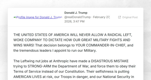 arrow-up1722arrow-down1external-linkPresident Donald Trump bans Anthropic from use in government systemsplus-squarewww.trumpstruth.orgBeep@lemmus.orgEnglish · 2 天前message-square176linkfedilink