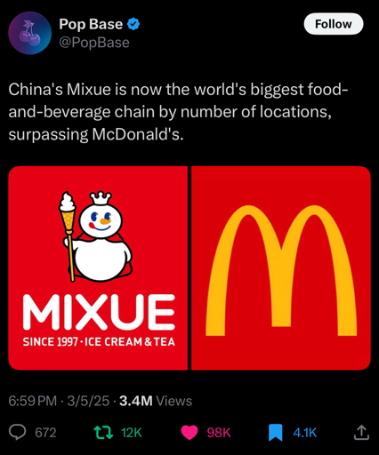 arrow-up11arrow-down1imageChina's Mixue is now the world's biggest food-and-beverage chain by number of locations, surpassing McDonald's.plus-squarelemmy.mlSpectre@lemmy.mlEnglish · 1 year agomessage-square0linkfedilink
