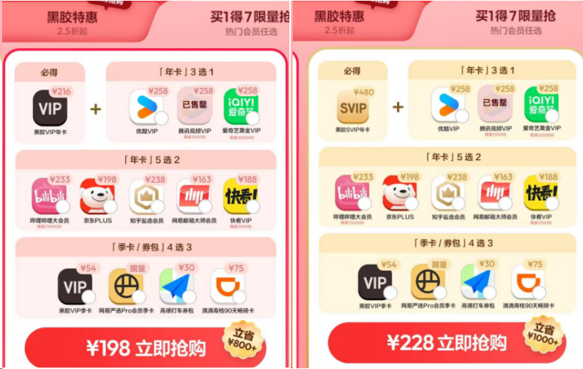 | 主权益 (3选1) | 优酷 VIP年卡 | 年卡 |