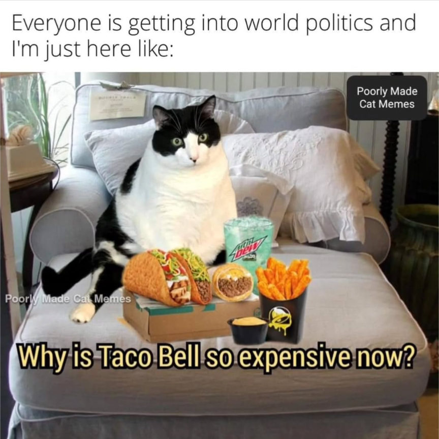 Yeah except I can get s whole ass meal every Wednesday and Friday for $2… No matter what I have to pay $7 at taco bell. Used to be like $2-$3 for a few decent filling burritos