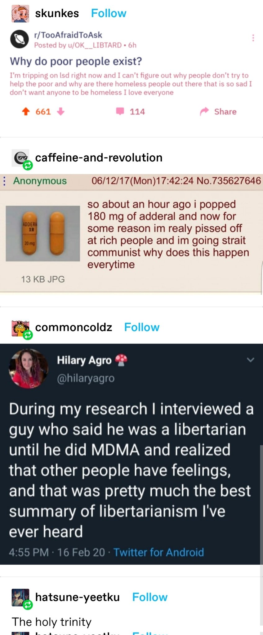EDIT: i’m incredibly disappointed how prodrugs you guys are here or rather, how loud the prodrugs minority here is. Oh well, nothing new in english-speaking internet communities, much less than on reddit actually. FYI i’m not for prohibition because that rarily work, especially now when western devil is out of the box - before if worked pretty well in socialist countries not being infiltrated by the western druglords, which is yet another proof how much the entire drug issue (or monolith as one nitpicker below tried to say) is an issue of class war and systemic opression. I’m for legalisation of mild substances, but also strict reglamentation and control. Dealers get wall, especially in socialism when they will have no soapy excuses i will undobtedly hear for the scum who “have no other option” than to prey on the working class now in capitalism.