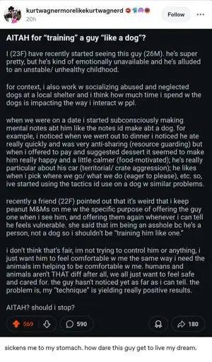 IDK as a guy this doesn’t seem weird at all. If anything, it sounds like she likes him and is willing to put in work to make him feel more comfortable and make the relationship successful. She doesn’t really use any dehumanizing language and the way she connects the dots between what she notices in dogs and her date seems very empathetic. If anything, the guy’s lucky to have found someone with so much emotional intelligence and hopefully she’s getting out what she’s putting in
