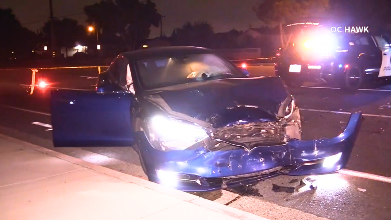 A Fullerton Police Department spokesperson said the officer was standing outside his vehicle around midnight when he saw a Tesla driving in his direction and not slowing down.
