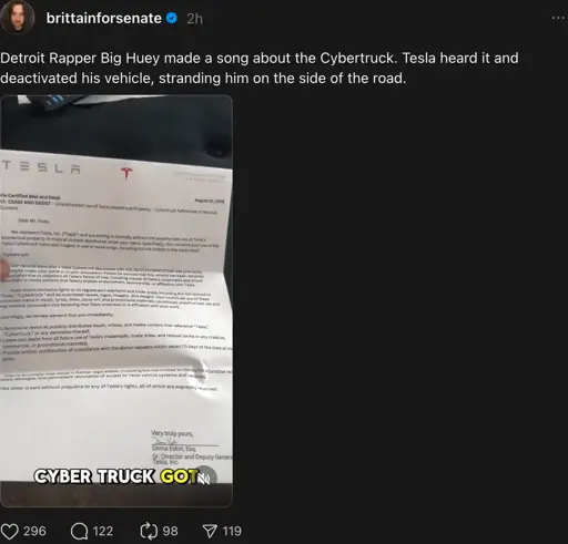 cross-posted from: https://lemmus.org/post/15293533 Link to the Threads post. Article: Tesla Allegedly Disables Rapper’s Cybertruck After Song Critique.