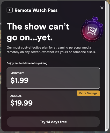 Oh, this is so true. I set it up and now can watch things anywhere. Even my kids who live 6 hours away can just jump on and watch that stuff. Jellyfin is what plex wanted to be, like 10+ years ago. I remember how stupid it was when they first started charging people to watch their own local media, it was funny at first because it was only on iphones that you had to pay. Then it was everywhere. They will continue to take features away until you pay.
