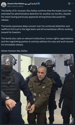 Dr Abu Safiya is one of those rare heroes who really has a love of the people. He’s a pediatrician (one of the ones who doubly specializes with freshly born babies whos lives aren’t measured in years or months but in hours) he stayed when Israel issued an evacuation order because “as long as there are patients, I won’t leave” (as quoted by dropsite news). He was illegally and without charge detained by Israel starting in December - probably the reason hes continued to be held hostage is cause hes a unifying resistance to genocide figure who was willing to put his life on the line for the people of Palestine, but who knows Israel does just arbitrarily detain Palestinians apropos nothing.