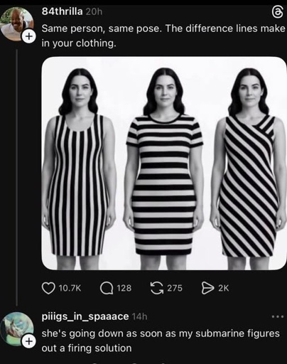 When they said the same pose, they just mean they are front facing, arms to the side, as opposed to different positions for each dress. It’s pretty darn close. She had to change dresses between shots, so the poses aren’t going to be perfectly identical, but they are close enough to make the point that a person looks different depending on the stripes.