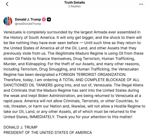 Source backing this up -> https://www.cnbc.com/2025/12/16/trump-orders-blockade-of-sanctioned-oil-tankers-leaving-entering-venezuela.html