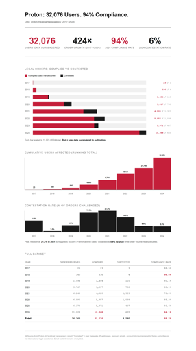 ☆ Yσɠƚԋσʂ ☆@lemmy.ml to Privacy@lemmy.mlEnglish · 9 days agoProton has handed over 32,076 users' data to governments since 2017. Their own transparency report states a 94% compliance rate in 2024.lemmy.mlimagemessage-square35linkfedilinkarrow-up1127arrow-down116