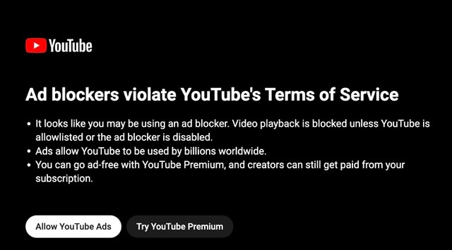Google has out and out made it a violation of their ToS to have an ad blocker to view Youtube. Or you can pay them $$$.