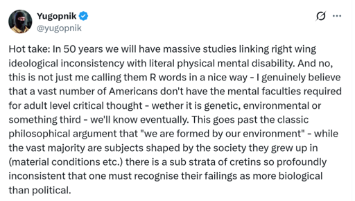 It’s telling that if you swapped out “right wing” for “left wing” in his post, it would be indistinguishable from eugenics style stuff that the right gets up to. So at a glance, it looks like pushing rightist ideology under the guise of “hello fellow leftists” (I don’t know much about him otherwise, so I don’t know what his other takes look like, if they are consistent with this look).