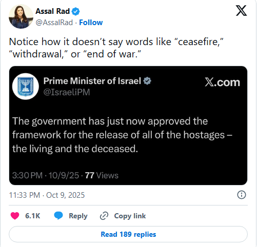 Like I said, Palestinians were not consulted on Trump’s “peace plan”. The plan entails total Palestinian surrender. Qatar and Egypt sent it to Hamas yesterday. Scahill detailed the conditions Hamas are in after the assassination attempt in Doha. Kept in isolation from each other, minimal use of any devices. How are they going to respond within 4 days is anybody’s guess1 of 3